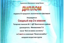13 декабрь көнне шәһәрнең экологик-биологик үзәгендә “Кояшлы күпер” фестивалендә җиңүчеләрне бүләкләү буенча Гала-концерт үткәрелде. Бу фестивальдә Минневәлиева Айсылу 2 нче урын яулады, Хөснетдинова Карина дипломант булды. Музыкаль трио (Зиннәтуллина Диләрә, Минневәлиева Айсылу, Хөснетдинова Карина) 3 урын яулады. 2 нче сыйныф укучыларыннан торган хор 2 нче урынга лаек булды.
