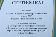 23 сентября состоялся Пленум Вахитовского и Приволжского районов по Профсоюзному движению и Школа №1 была награждена сертификатом за активное участие в Общероссийской профсоюзной акции "Подзарядка для всех", развитие здорового образа жизни и корпоративной культуры членов Профсоюза.