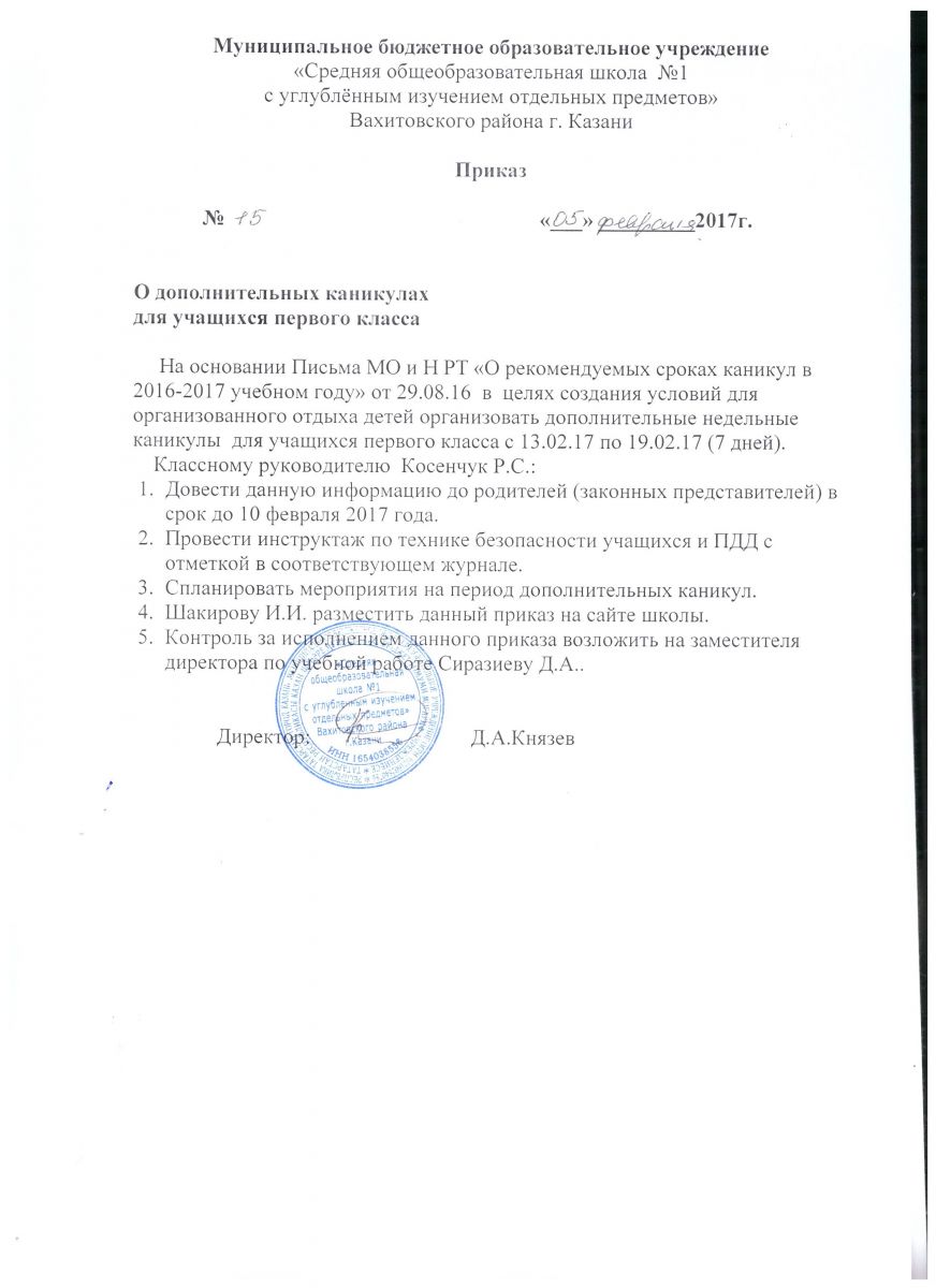 Муниципальное бюджетное общеобразовательное учреждение «Средняя общеобразовательная школа № 1» Вахитовского района г. Казани