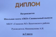 Поздравляем Совет Гимназии с 3 местом в городском конкурсе детской и юношеской прессы "Без права на ошибку" за Школьную газету "Око" Специальный выпуск, под руководством педагога-психолога Минневалеевой А.И.