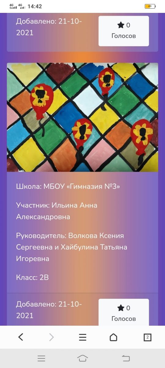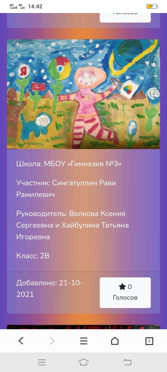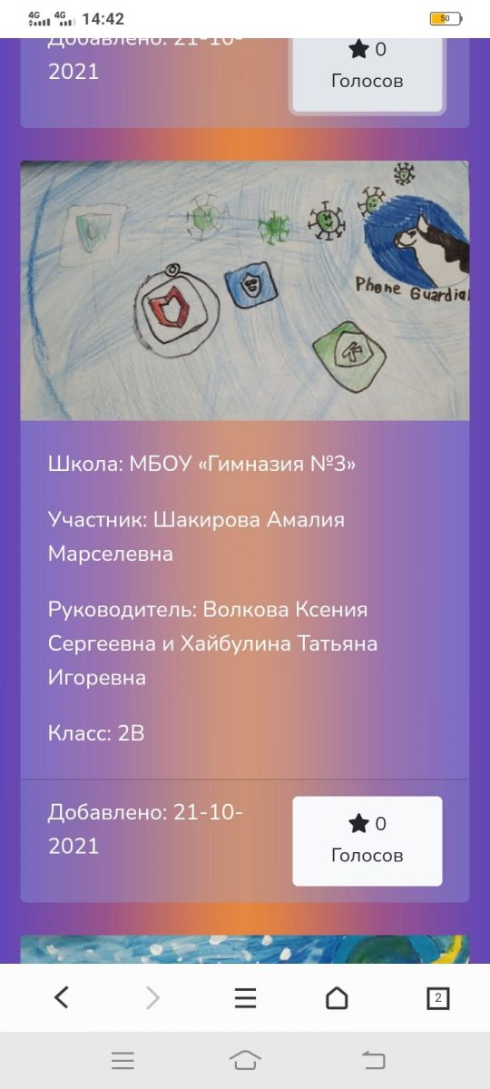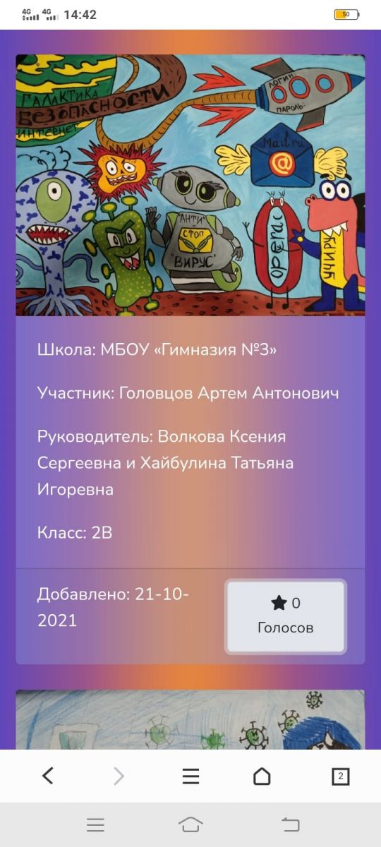 Опубликовано: 25.10.2021Проходит конкурс рисунков на тему «Галактика информационной безопасности», в котором приняли участие ученики 2в класса. Просьба пройти по ссылке и проголосовать за понравившуюся работу.