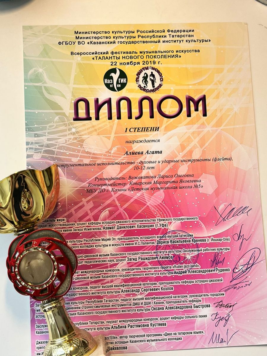 Диплом 1 степении, инструментальное исполнительство - духовые и ударные инструменты (флейта)
