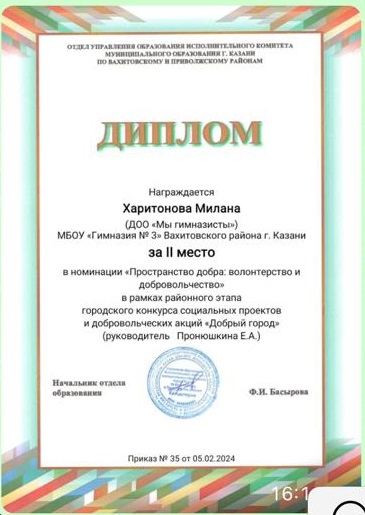Опубликовано: 27.03.2024Поздравляем Харитонову Милану за 2 место в номинации "Пространство добра: волонтерство и добровольчество"