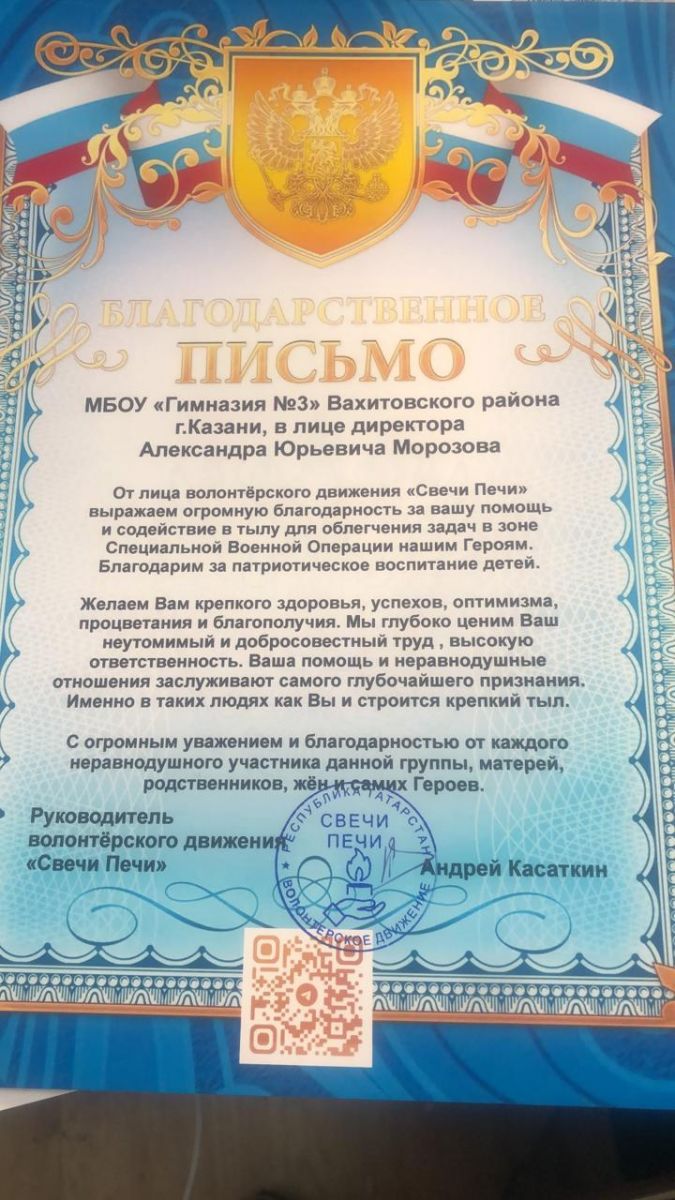 Опубликовано: 06.05.2024Гимназии присвоили значок "Волонтер СВО"