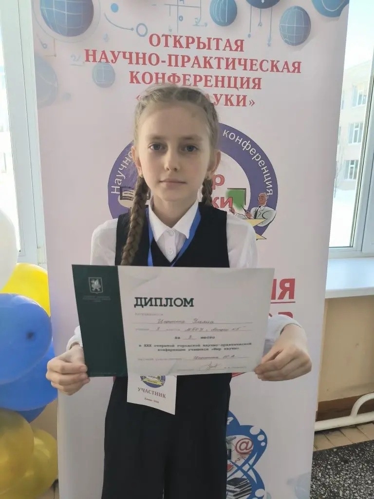 Ульяна завоевала 3 место на XXX открытой научно-практической конференции «Мир Науки»! Это прекрасный старт в мир исследований и открытий. Желаем Ульяне дальнейших успехов и новых побед!Огромное спасибо руководителю, Игошиной Юлии Александровне, за ценный вклад в развитие юных талантов.