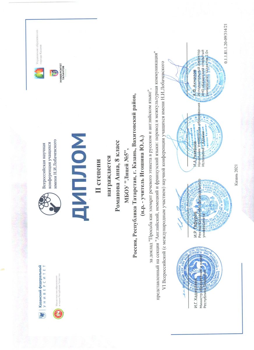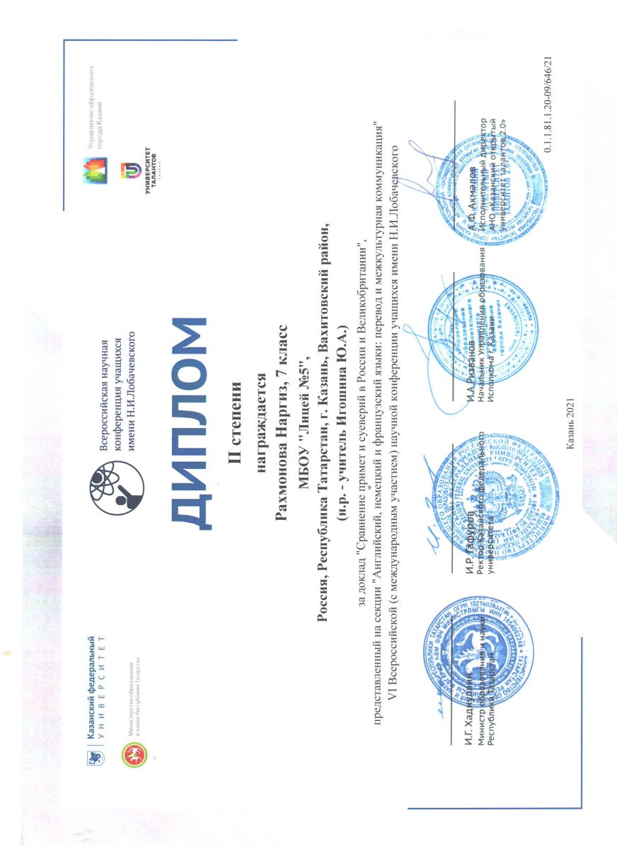 29.03.2021 года состоялось награждение призеров и победителей VI Всероссийской (с международным участием) научной конференции учащихся имени Н. И. Лобачевского. Ученицы 7 а класса Рахмонова Наргиз и 8 а класса Романова Анна под руководством учителя английского языка Игошиной Юлии Александровны приняли участие в конференции и заняли 2 место каждый в своей возрастной группе. Поздравляем девочек и желаем им дальнейших успехов!