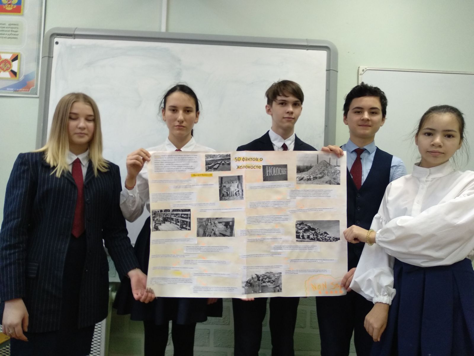 27 января, в Международный день памяти жертв Холокоста, учащиеся 8 «В» класса выпустили газеты. 27 января 1945 года войска Советской Армии освободили первый и самый большой из гитлеровских концлагерей Аушвиц (Освенцим), расположенный в 70 километрах от Кракова. В фашистских лагерях было уничтожено 6 миллионов евреев и миллионы лиц других национальностей. Об этом и других фактах рассказали учащиеся в своих работах. Газеты представлены в фойе Лицея.