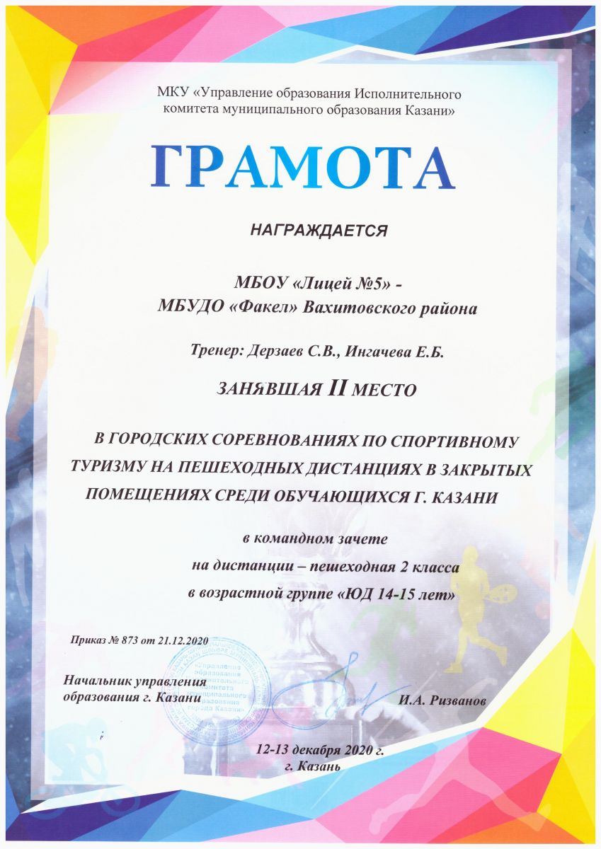 Поздравляем команду 5 лицея в составе: Хевронина Елизавета, Девятова Анастасия, Романова Елизавета, Степанов Арсен( 8 «В»класс), Кудряшов Егор, Запбаров Тимур, Захаров Андрей, Пузанова Катя ( 3 «Б» класс) и Романов Александр (2 «В» класс»)! В МБУДО «Дом детского и юношеского туризма и экскурсий «Простор» Ново-Савиновского района» г. Казани прошли городские соревнования по спортивному туризму на пешеходных дистанциях в закрытых помещениях. В соревнованиях принимали участие две команды нашего лицея в старшей и младшей возрастной группе. В двух командных зачетах 1 и 2 класса наши команды заняли 2 место. В личном первенстве, Кудряшов Егор (3 «Б» класс) и Хевронина Елизавета (8 «В» класс) заняли 3 место.