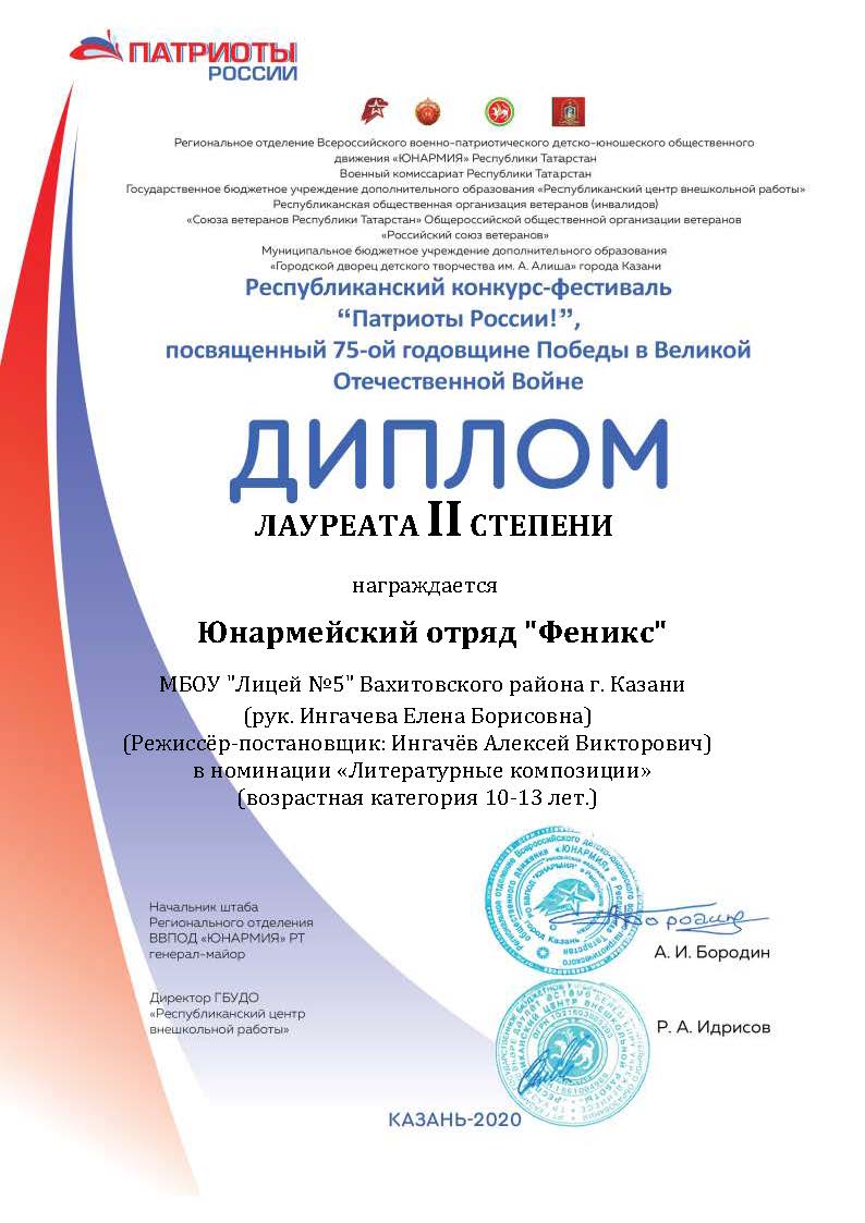 Поздравляем юнармейский отряд «Феникс» лауреатов 2 степени Республиканского конкурса !. В начале ноября вГДДТ им. А. Алиша прошел Республиканский конкурс-фестиваль «Патриоты России!», посвященный 75-ой годовщине Победы в Великой Отечественной войне, на котором юнармейский отряд «Феникс» нашего Лицея представил Литературно-музыкальную композицию «Казань-город трудовой славы!». Жюри высоко оценило выступление ребят, присудив им 2 место.