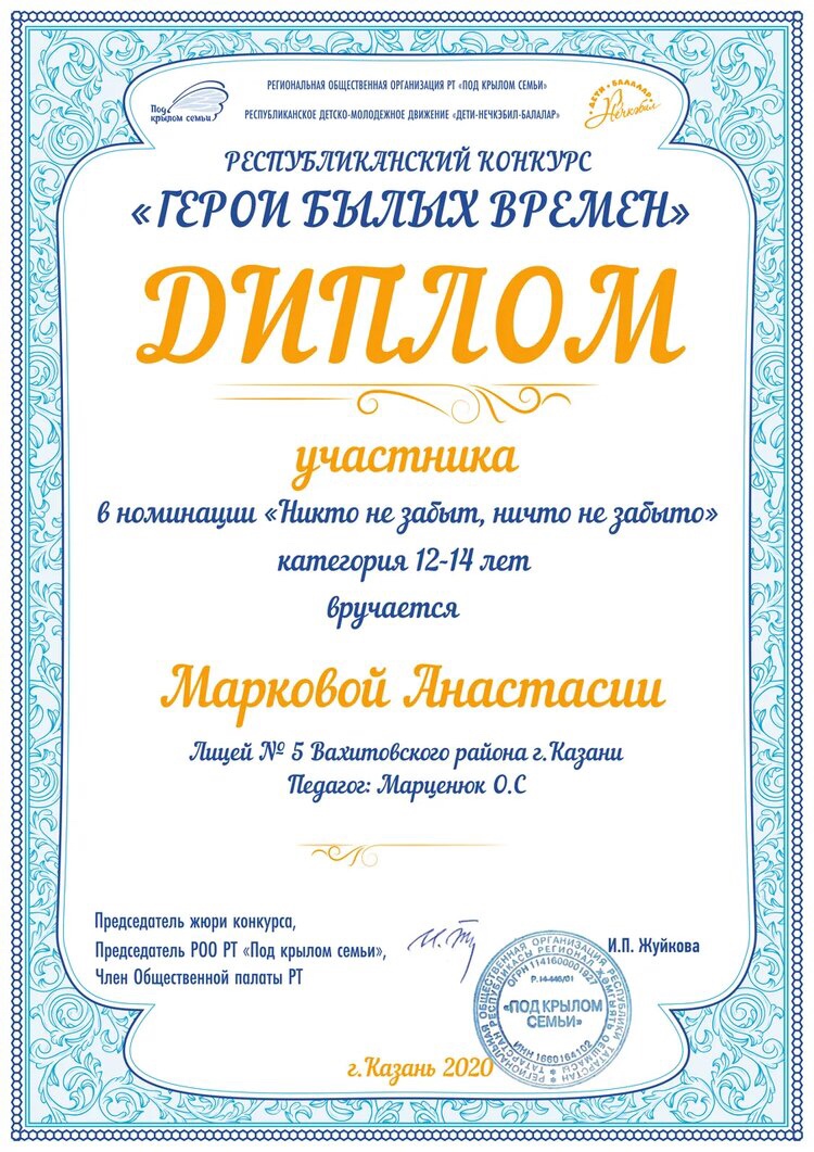 В числе участников есть и ученики нашего лицея. В номинации «Никто не забыт, ничто не забыто» Маркова Анастасия (7Б класс) и Зайниева Ралина (5В класс) представили художественное чтение стихотворений. Девочки получили дипломы участников.