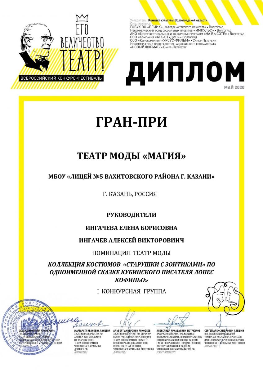 Театр моды «Магия» завоевало «Гран-при» на Всероссийском конкурсе — фестивале "Его величество-театр" , который прошел с 1-15 мая в городе Волгограде. На суд жюри была представлена коллекция «Старушки с зонтиками».