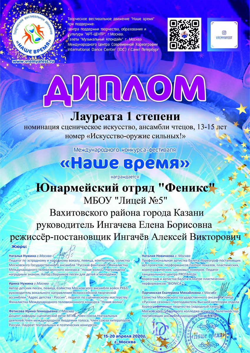 Творческая группа юнармейского отряда «Феникс» (учащиеся 7 «В» класса) приняли участие в Международном фестивале-конкурсе «Наше время». Выступление посвящено 75-летию Победы в Великой Отечественной войне. Литературно-музыкальная композиция «Искусство — оружие сильных!» была высоко оценена жюри . Юнармейский отряд «Феникс» стали Лауреата 1 степени. Так держать! Желаем дальнейших успехов!