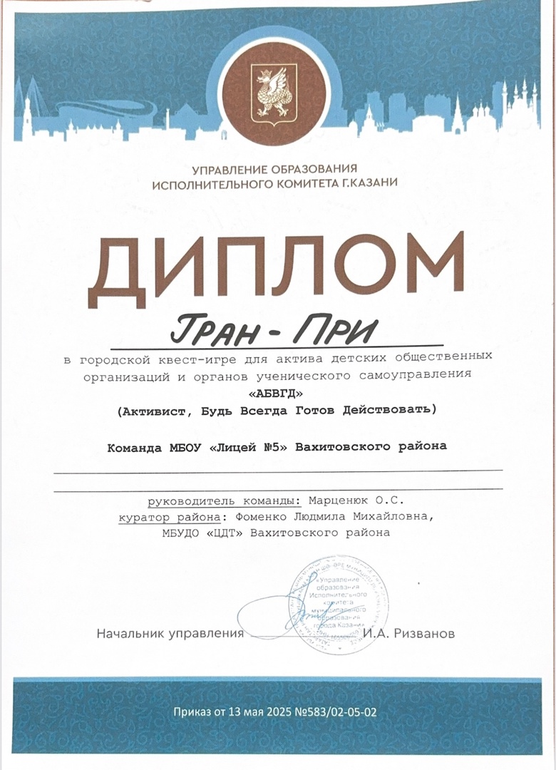 Поздравляем активистов школьного ученического самоуправления - Трифонову Ариану, Трифонову Алисию, Романову Софью, Зайниеву Ралину, Прокофьеву Викторию, Мухамадееву Марям, Гаптуллову Лину - с успешным выступлением в городской квест-игре для актива детских общественных организаций и органов самоуправления «А Б В ГД » (Активист, Будь Всегда Готов Действовать).
