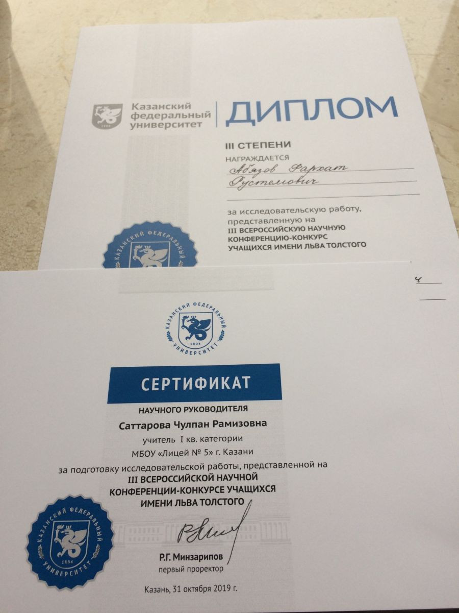 Сегодня, 31 октября в Институте филологии и межкультурной коммуникации Казанского федерального университета прошла III Всероссийская научная конференция-конкурс учащихся имени Льва Толстого. Ученик 10 б класса Абязов Фархат получил диплом 3 степени за исследовательскую работу в секции «Лингвокультурное наследие стран изучаемого языка». Под руководством учителя английского языка Саттаровой Чулпан Рамизовны он представил работу «Влияние женщин на управление страной». Организаторы подарили участникам подарки с логотипом КФУ.А лучшие работы будут напечатаны в сборнике конференции. Желаем нашим участникам успехов и новых побед!