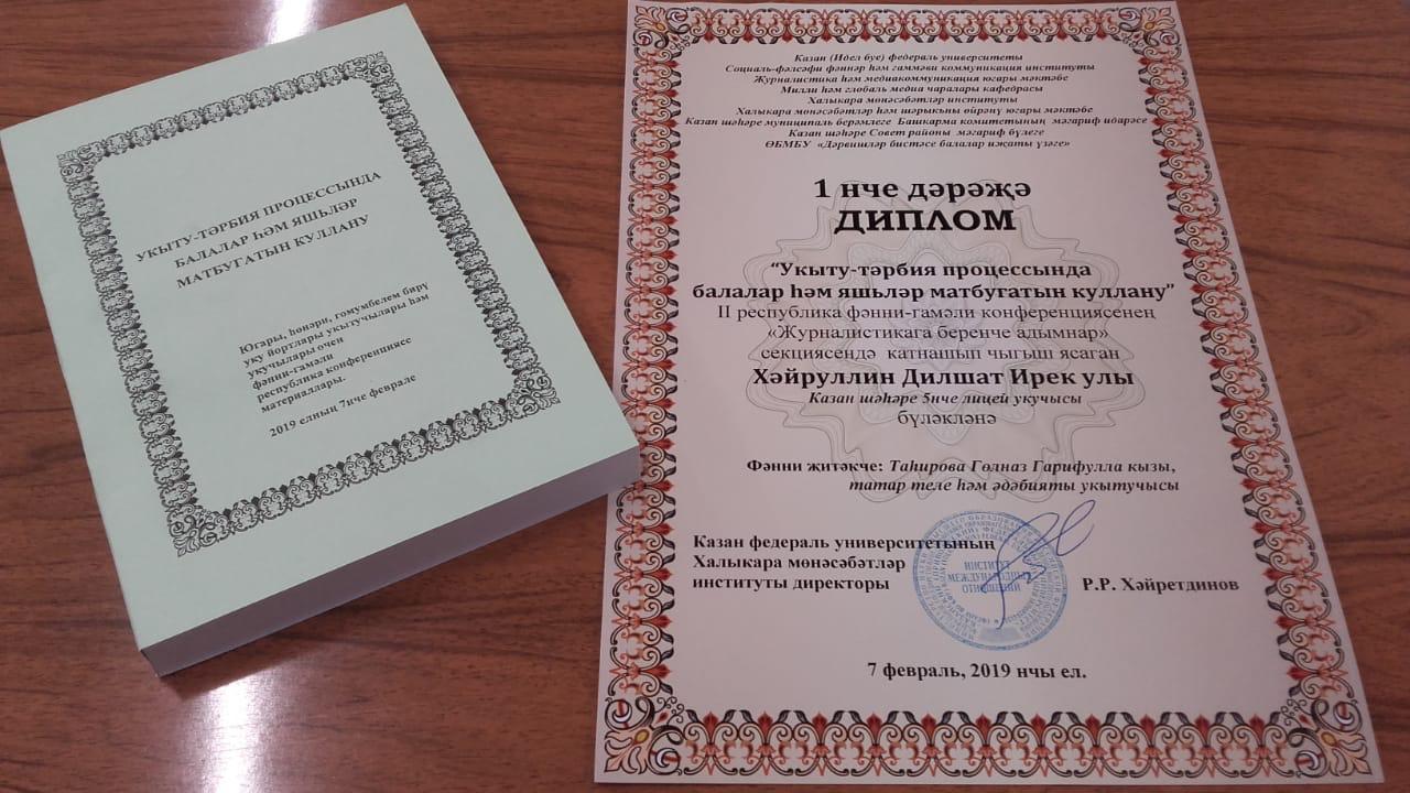 институтом международных отношений Казанского федерального университета. Учащийся нашего лицея Хайруллин Дильшат (8Б класс) принял участие в данной конференции, и был награждён дипломом I степени. Работа Дильшата вошла в сборник материалов Казанского федерального университета, который был опубликован. Руководитель- учитель родного языка Тагирова Гульназ Гарифулловна.