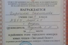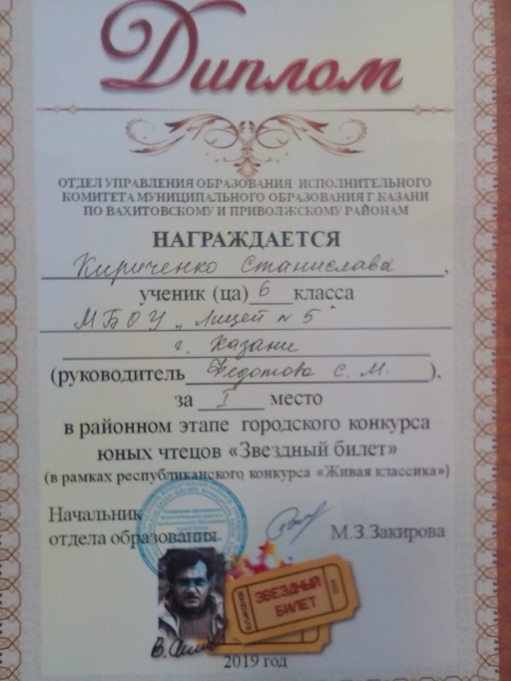 23 января 2019 года ученица 6 класса Кириченко Станислава приняла участие в районном этапе городского конкурса юных чтецов «Звездный билет» и заняла 1 место (учитель Федотова С.М.). Желаем Станиславе успехов, победы в городском этапе конкурса !!!