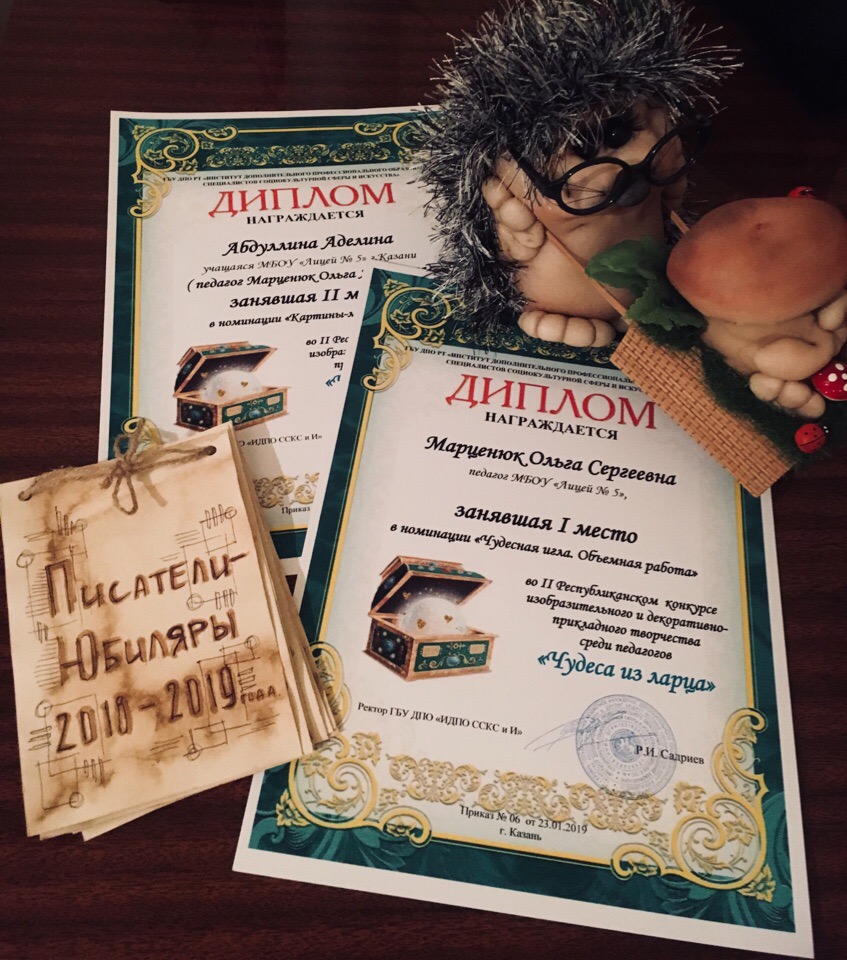 Ученица 11Б класса Абдуллина Аделина и педагог Марценюк О. С. приняли участие во II Республиканском конкурсе изобразительного и декоративно-прикладного творчества «Чудеса из ларца». Их работы заняли 1 и 2 места.
