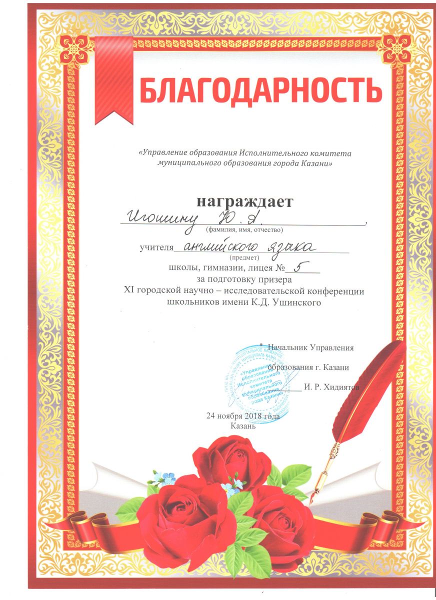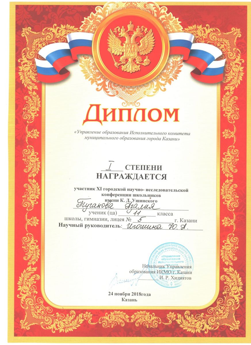 Поздравляем ученицу 11 "б" Туганову Азалию, занявшую 1 место на 11 городской научно-исследовательской конференции школьников имени К. Д. Ушинского. Научный руководитель Игошина Юлия Александровна