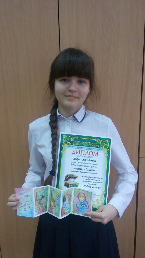 На конкурс она представила работу «Сюжетные картинки к рассказу Л. Н. Толстого «Котенок» (номинация «Картины-миниатюры»).