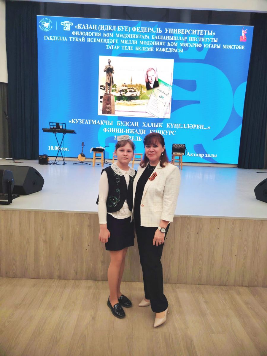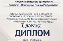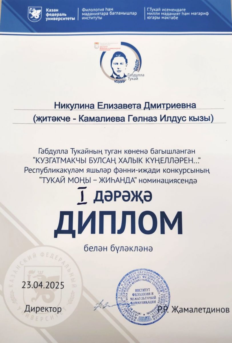 Никулина Елизавета, ученица 4б класса, заняла 1 место в Республиканском конкурсе, посвященном Дню рождения Г. Тукая "Кузгатмакчы булсаң халык күңелләрен..."