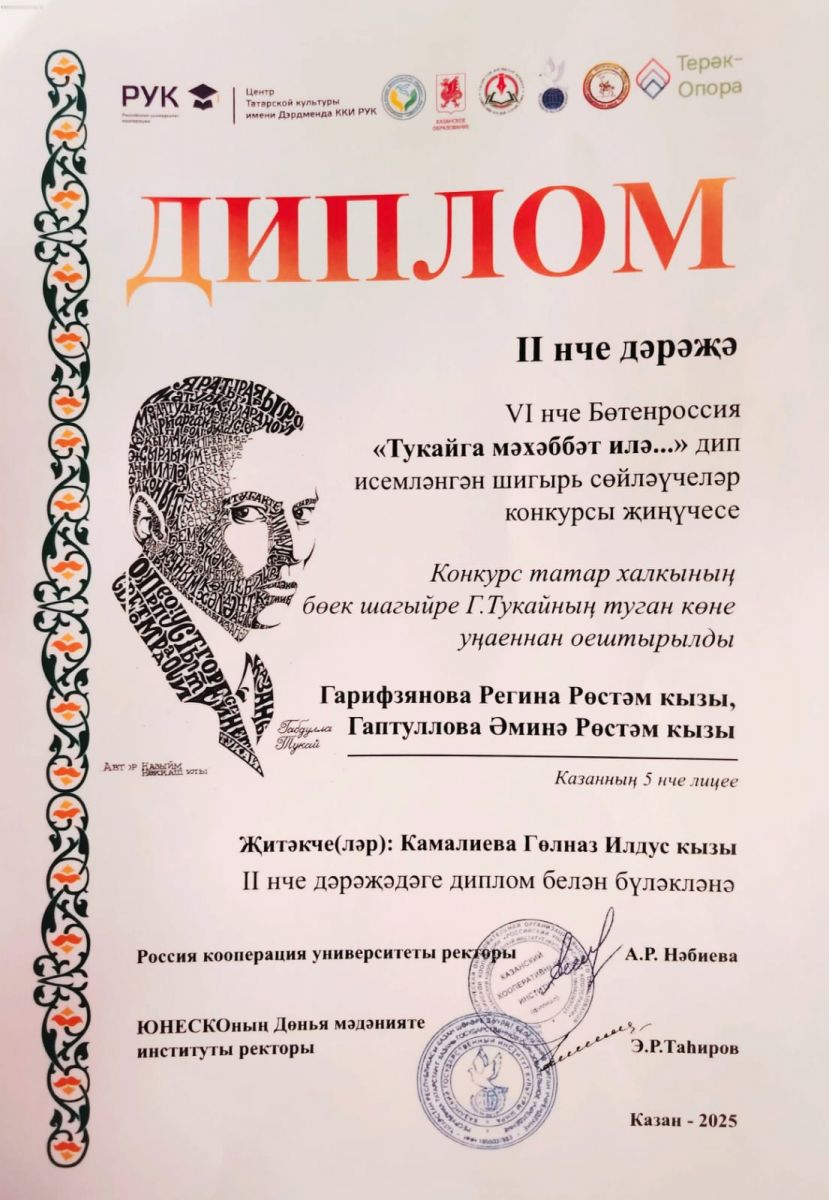Гарифзянова Регина и Гаптуллова Амина, ученицы 2в класса, заняли 2 место в VI Всероссийском конкурсе, посвященном дню рождения Г. Тукая "Тукайга мәхәббәт илә..."