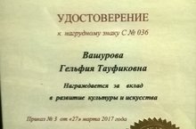Поздравляем Вашурову Гульфию Тауфиковну- руководителя театральной студии "Непоседы" с присуждением нагрудного знака "За вклад в развитие культуры и искусства"