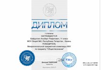 Поздравляем ученика 11а класса Хайруллина Альберта Рифатовича с ПОБЕДОЙ на Межрегиональной предметной олимпиаде КФУ по предмету «Обществознание» - диплом I степени!!! Учитель – Рисположенская О.В.