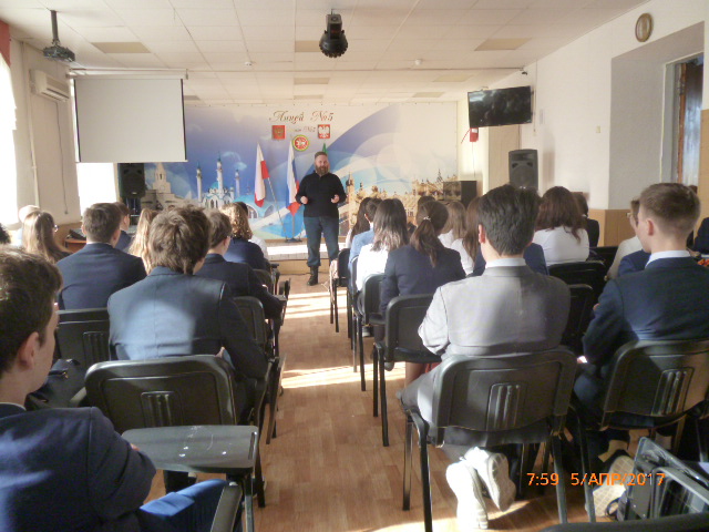 5 апреля 2017г. в лицее №5 в рамках формирования правовой культуры и гражданской позиции правового информирования в сфере призыва состоялась встреча старшеклассников с руководителями Региональной общественной правозащитной организации родителей призывников РТ «За сыновей» Алеткиным Германом Николаевичем и Ниной Витальевной. Ребята познакомились с АГС (ст. 59 «Конституции РФ»), обязанностями и правами призывников. Гости ответили на вопросы.