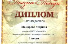 Поздравляем учащихся 2 "В" класса Борзову Алину, Блохина Савелия, Закирову Аделю, Романову Елизавету и Хевронину Елизавету с ПОБЕДОЙ в городском конкурсе стихов о Великой Отечественной войне "Во имя мира на земле". Кроме дипломов победителей им вручены Дипломы "За солнечное творчество" Международной акции "Солнечный храм". Молодцы! Желаем успеха и удачи на Республиканском этапе конкурса.