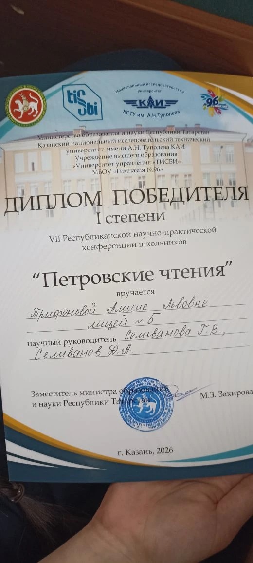 30 марта на базе МБОУ «Гимназия №96» прошла Открытая Республиканская научно-практическая конференция «Петровские чтения». Наши ученицы 11в класса Трифонова Алисия и Трифонова Ариана и здесь одержали победу! Поздравляем Трифонову Алисию (диплом 1 степени), Трифонову Ариану (диплом 2 степени), Селиванову Г.В. и Селиванова Д.А.! Вот такие насыщенные выдались у нас каникулы!