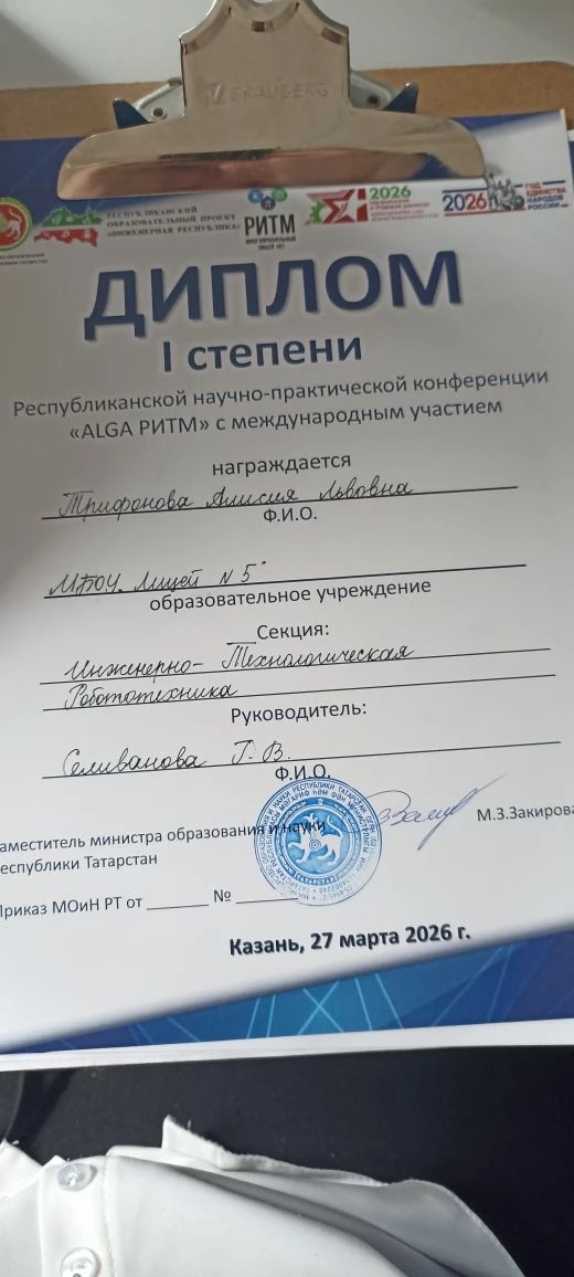 Поздравляем Быстрова Платона, ученика 4 В класса, с блестящей победой на Республиканской научно-практической конференции «ALGA РИТМ»! 1 МЕСТО в инженерно-технической секции - это результат таланта, упорства и настоящего инженерного мышления. Платон доказал, что даже в начальной школе можно решать серьёзные задачи и побеждать на самом высоком уровне!
