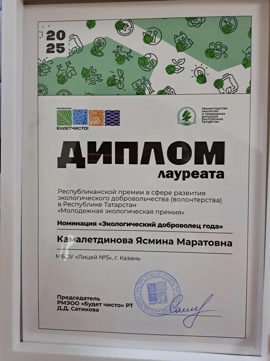Ученица 5а класса - Камалетдинова Ясмина стала лауреатом Республиканской премии в сфере развития экологического добровольчества в Республике Татарстан в номинации «Экологический доброволец года»
