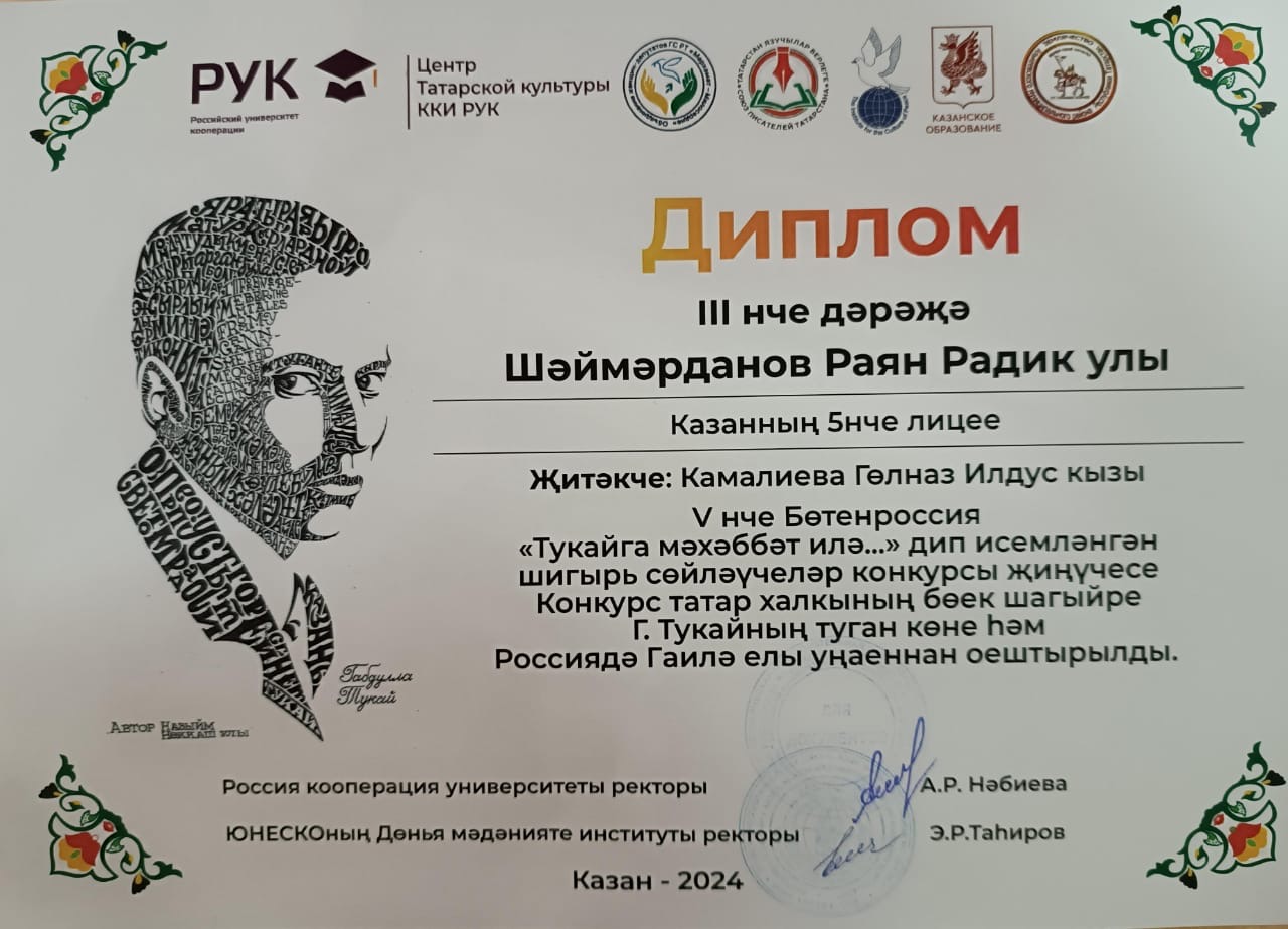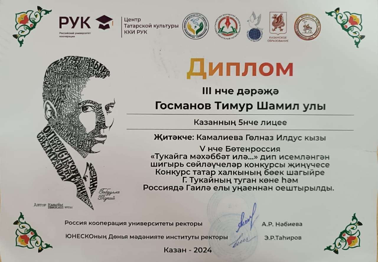 Среди участников есть и ученики нашего лицея: Галимзянова Регина(1В), Гусманов Тимур(1в), Шаймарданов Раян(4А). Ребятам были вручены дипломы III степени и памятные подарки. Поздравляем! Желаем дальнейших успехов! -