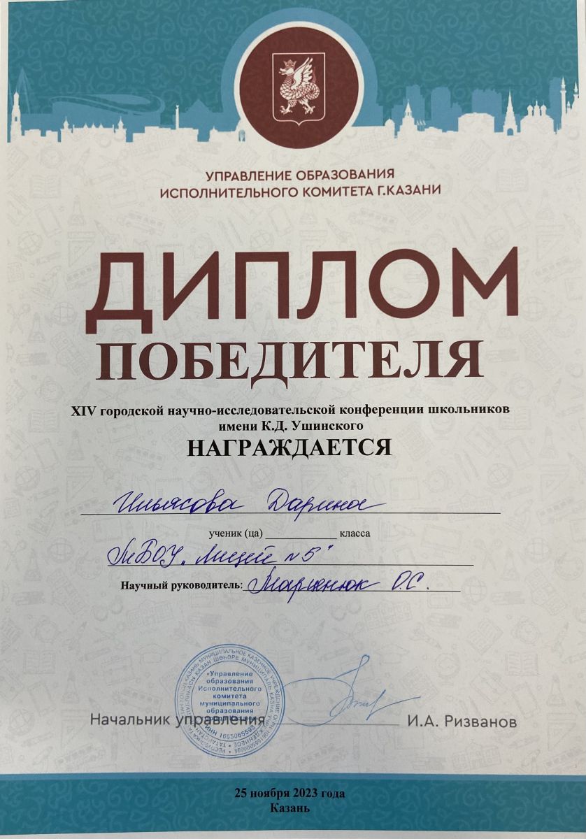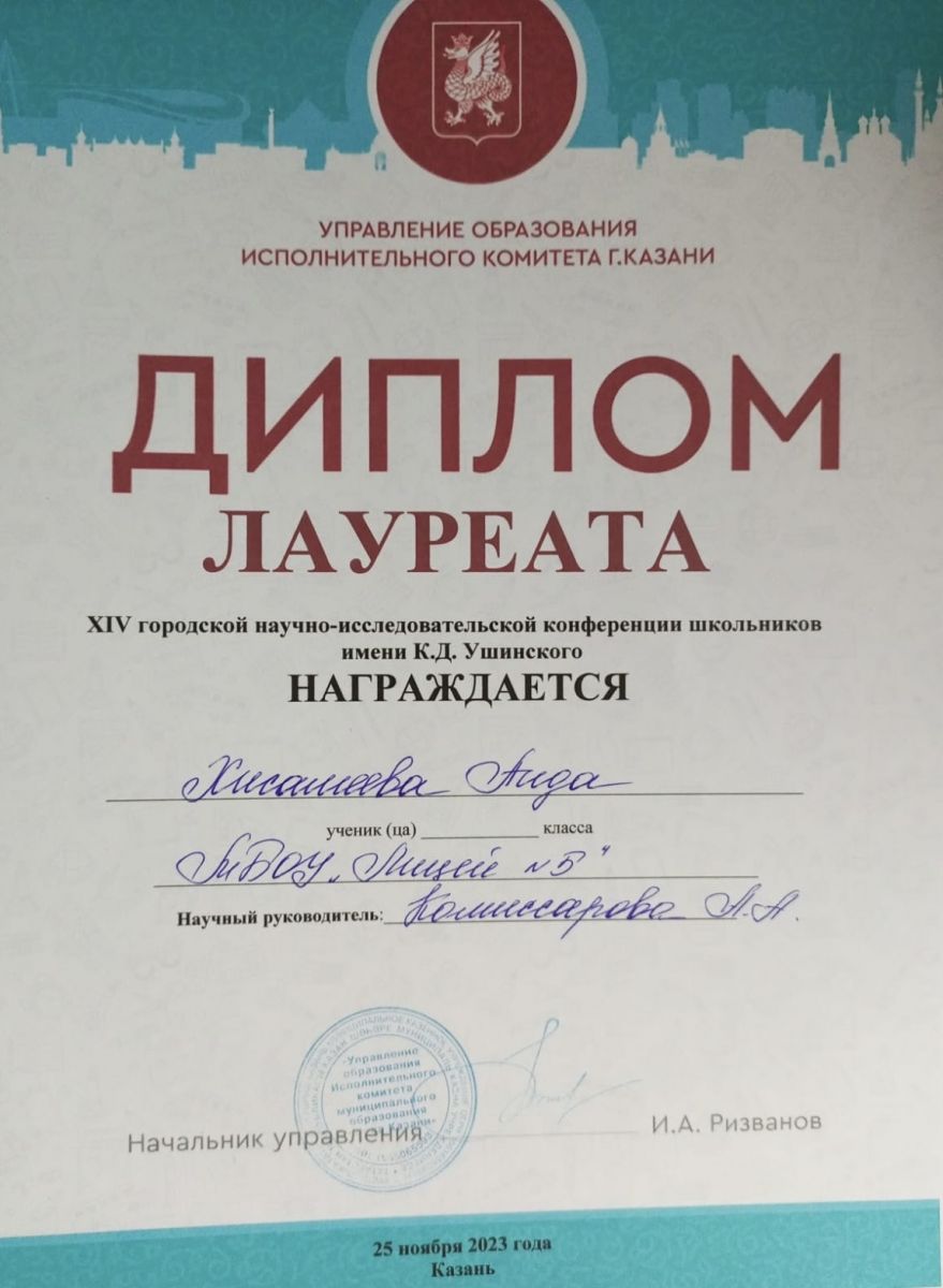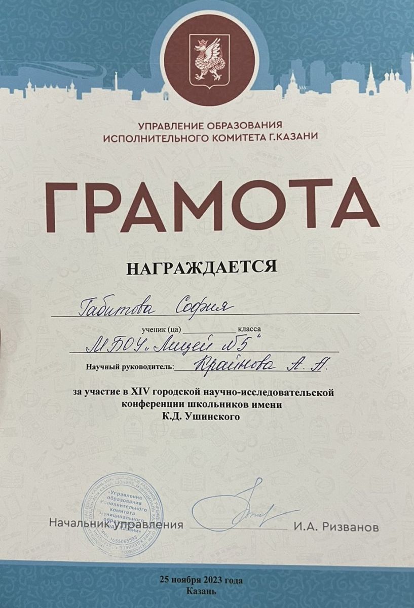 25 ноября на базе МАОУ «Гимназия №37» Авиастроительного района г. Казани состоялась XIV Городская научно-практическая конференция им. К.Д. Ушинского. Работало 12 секций. В каждой аудитории царила атмосфера всеобщей заинтересованности, творчества и сотрудничества. Членами жюри на конференции выступили учёные, преподавали разных вузов. Обучающиеся нашего лицея приняли активное участие в конференции: