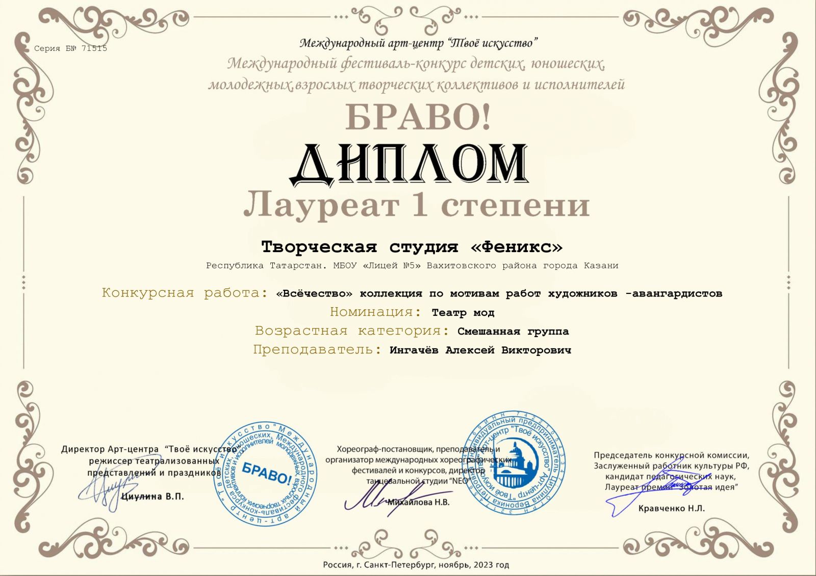 Поздравляем Творческую студию «Феникс» (руководитель Ингачёв Алексей Викторович) с победой в Международном фестивале-конкурсе детских, юношеских и молодежных творческих коллективов и исполнителей «Браво». На суд жюри была представлена коллекция моделей «Всёчество» по мотивам работ художников -авангардистов.