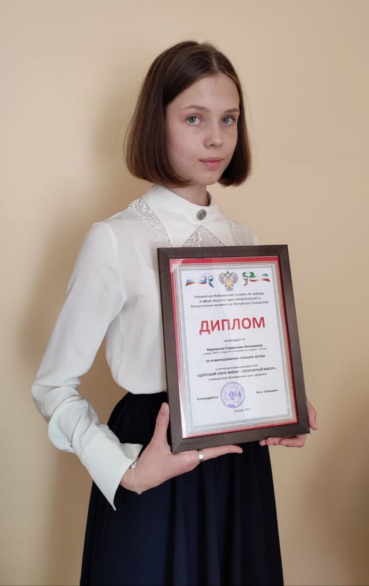 Ученица 10а класса Кириченко Станислава стала призёром в региональном конкурсе эссе «Здоровый образ жизни - осознанный выбор», который проводило Управление Роспотребнадзора по РТ.