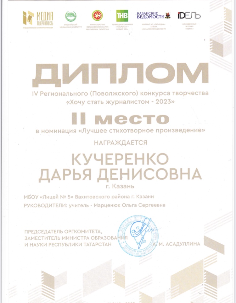 Наш лицей представила ученица 10б класса Кучеренко Дарья( руководитель Марценюк О.С.).В номинации «Лучшее стихотворное произведение» - почетное 2 место.