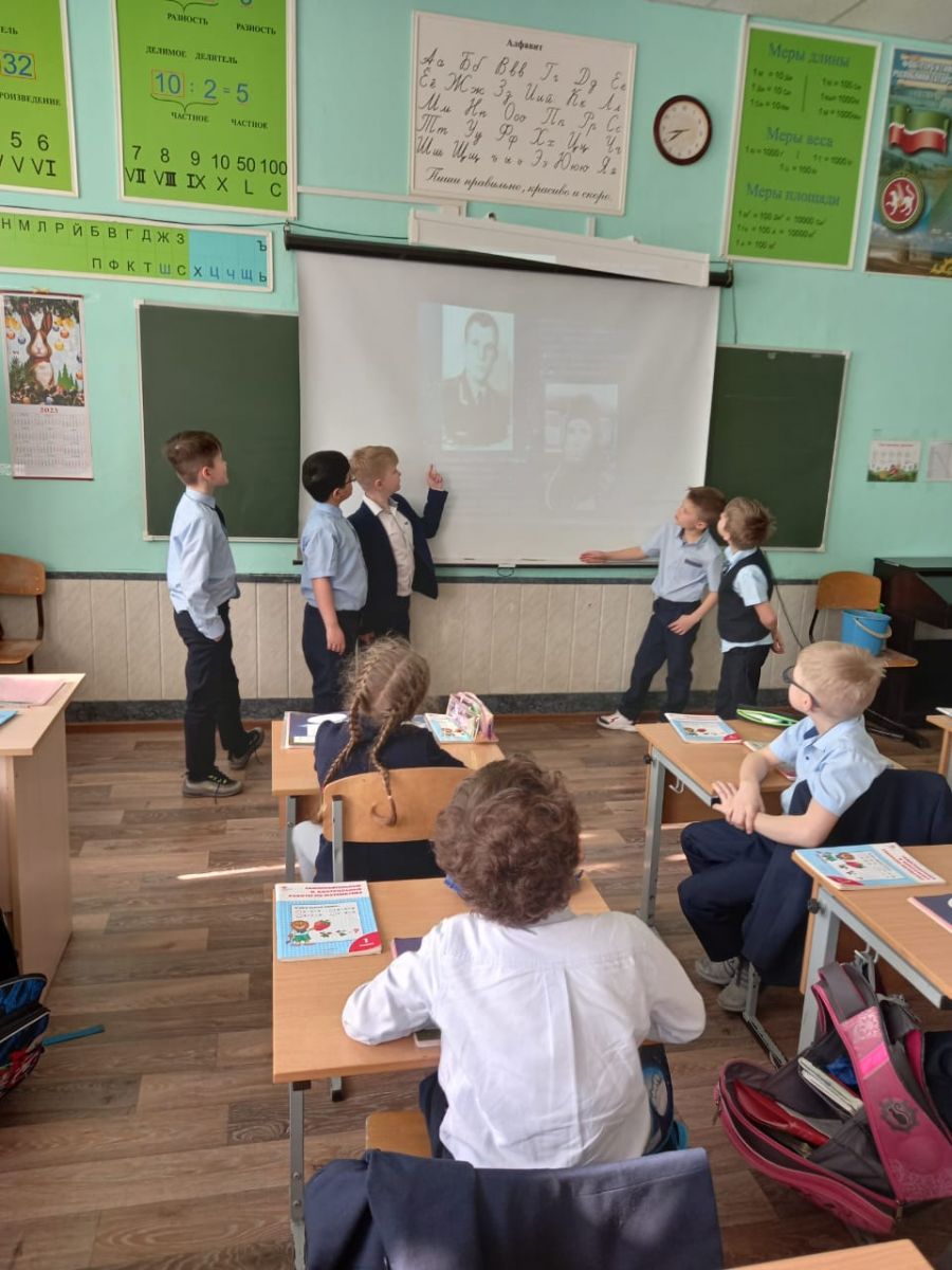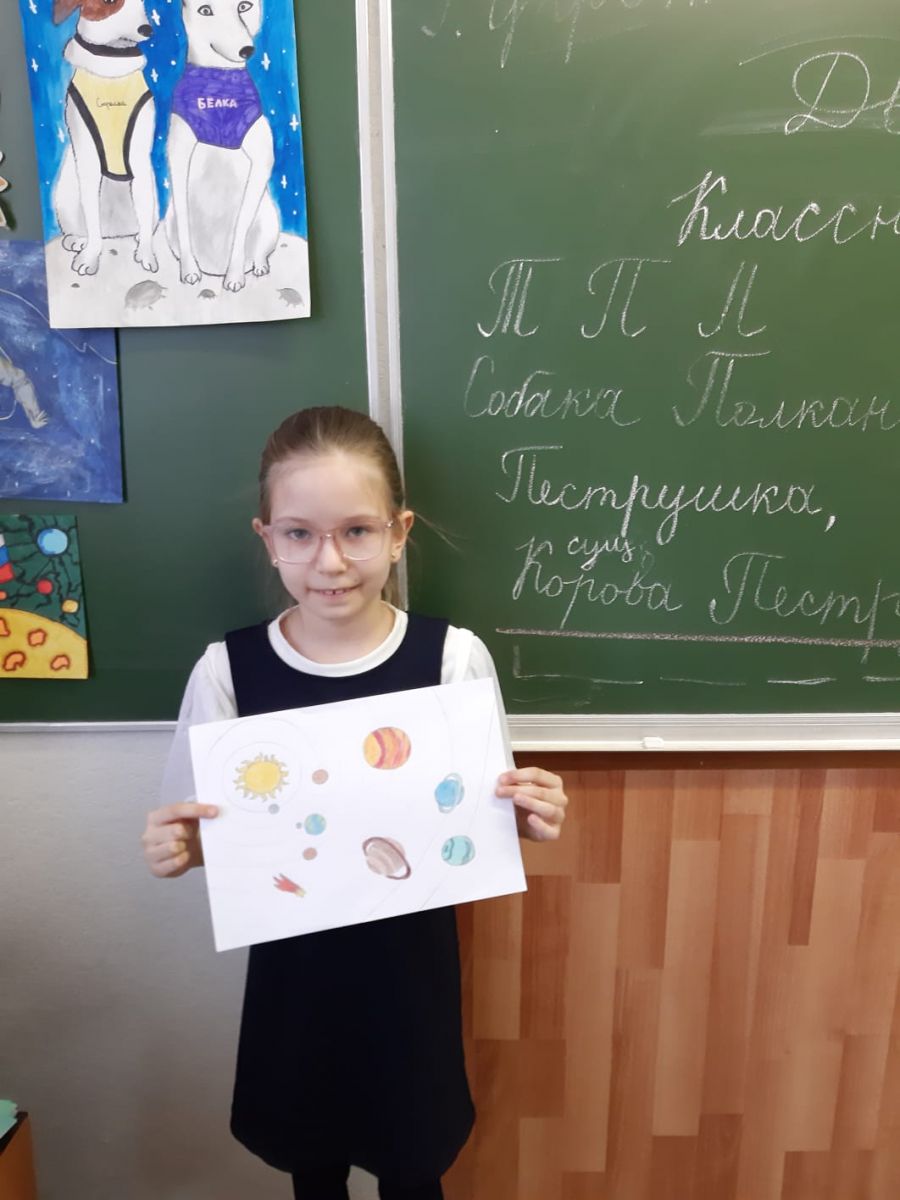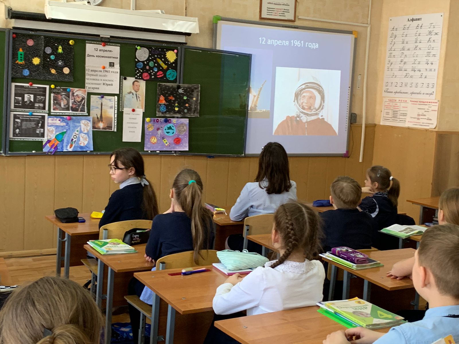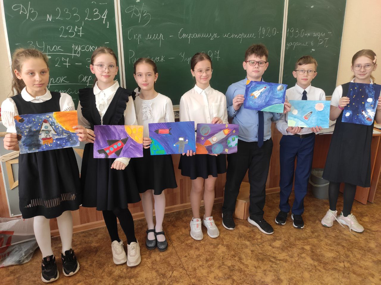 В 4б классе ко Дню космонавтики прошел конкурс рисунков. Перед этим обучающиеся познакомились с тем, как готовят космонавтов, как устроен комплекс «Союз», вспомнили о том, что увидели в Планетарии. А, уже после этого воплотили свои впечатления на бумаге. В 1А классе ребятами был просмотрен фильм «Звезда по имени Гагарин»