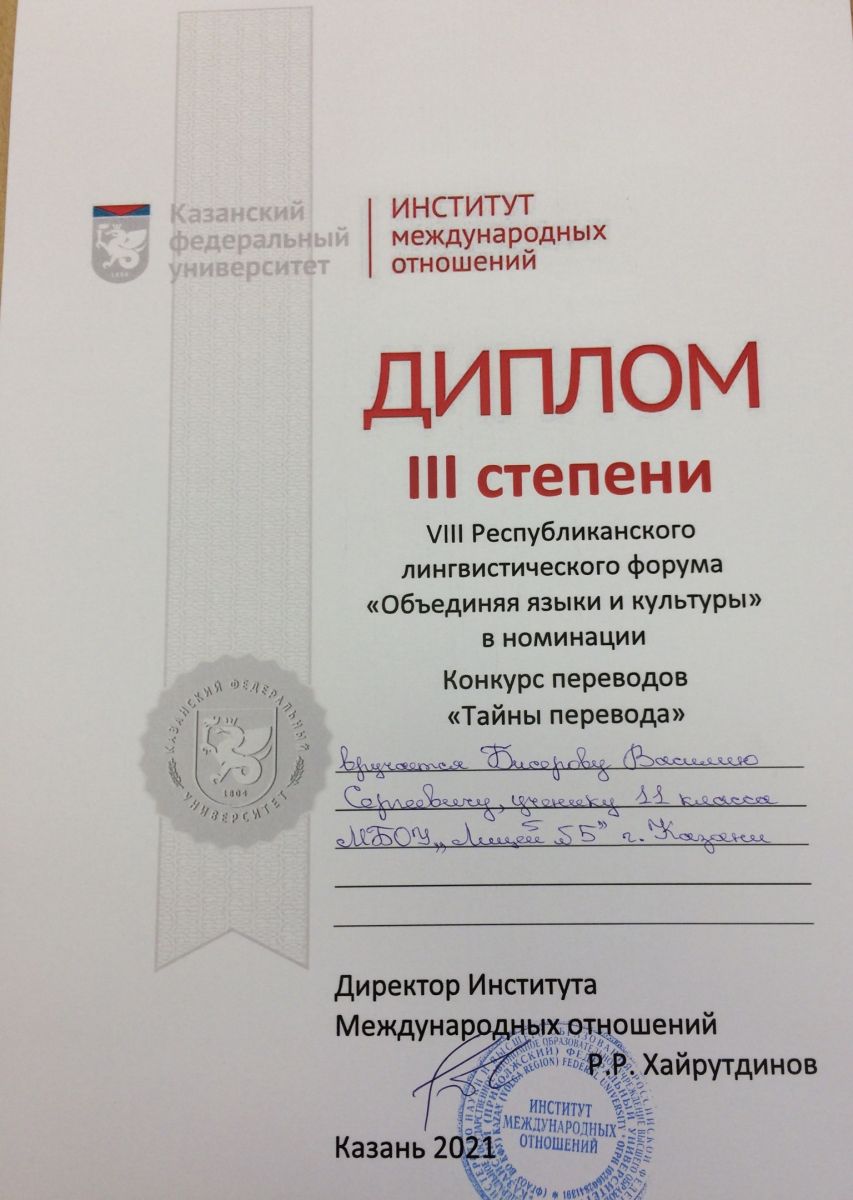 Новинкой-2021 явился старт новой площадки Форума – «Школа переводчика». Ученик 11 А класса Бисеров Василий получил диплом III степени в номинации Конкурс переводов «Тайны перевода»,учитель-Саттарова Чулпан Рамизовна.