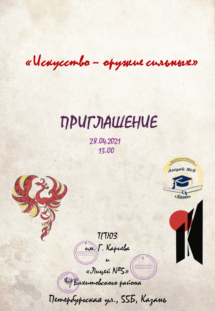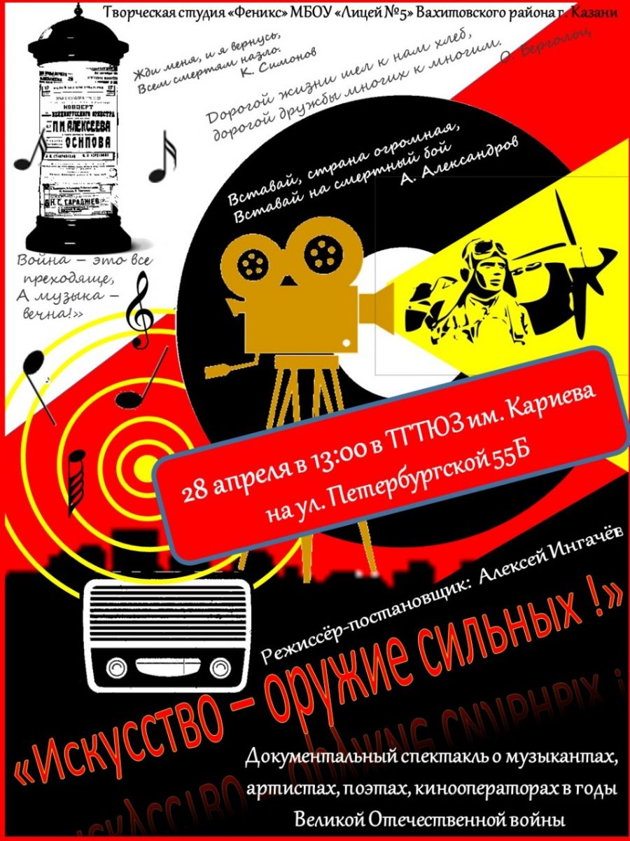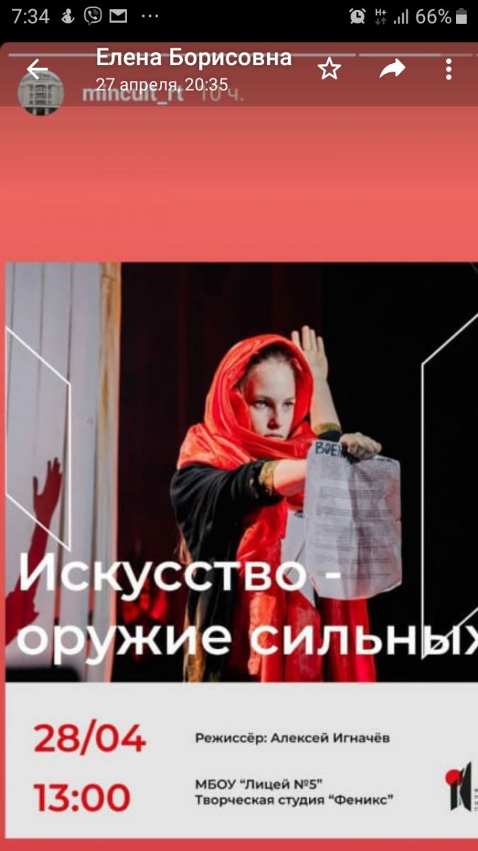 28 апреля в театре им Кариева , который любезно согласился принять участие в мероприятии подготовленном совместно с МБОУ "Лицей 5 " и обучающимися 8В класса для ветеранских организаций города в честь празднования 9 мая- показ спектакля "Искусство оружие сильных" . Ветераны высоко оценили работу лицея по патриотическому воспитанию и талант юных артистов 8 В класса и классного руководителя Ингачевой Е..Б. ,а особую благодарность за режессёрский ход в постановке спектакля Алексею Ингачеву.