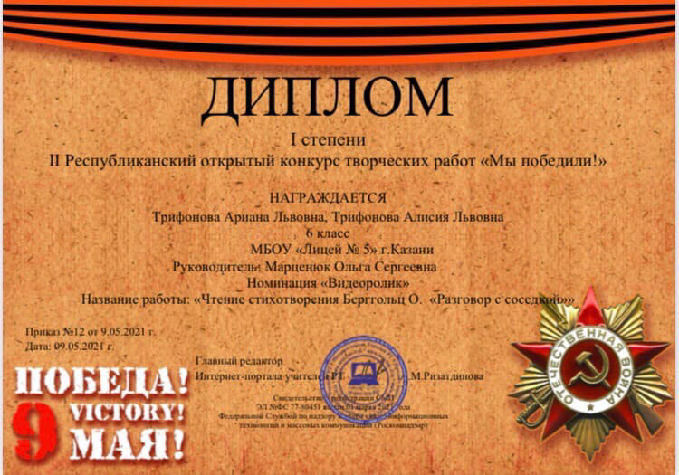 В рамках II Республиканского открытого конкурса творческих работ «Мы победили!» ученицы 6в класса – Трифонова Ариана, Трифонова Алисия и Зайниева Ралина прочитали наизусть прозаические и лирические отрывки. Выступления девочек были трогательные, наполненные искренними чувствами.