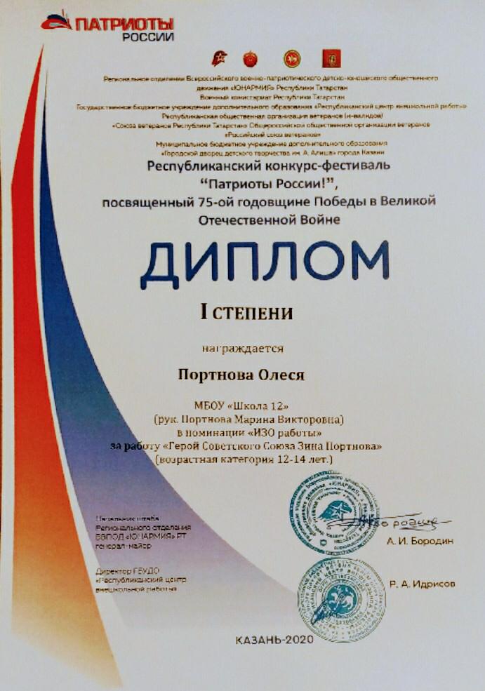 Ученица 6а класса Портнова Олеся представила свою работу на Республиканском конкурсе-фестивале «Патриоты России», посвящённом 75-й годовщине Победы в Великой Отечественной войне, и заняла почетное 1 место. Поздравляем Олесю и желаем дальнейших побед!