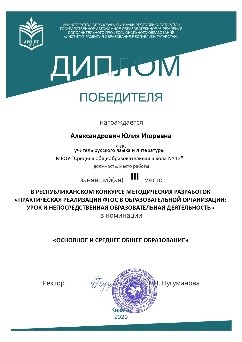 30 ноября 2020 года подведены итоги республиканского конкурса методических разработок «Практическая реализация ФГОС в образовательной организации: урок и непосредственная образовательная деятельность». Поздравляем Александрович Юлию Игоревну, учителя русского языка и литературы, занявшую 3 место в номинации «Основное и среднее образование» (Филологический цикл)!