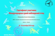 Ученики нашей школы, под руководством преподавателя биологии Анисимовой Ирины Николаевны, приняли активное участие в международной прграмме по охране птиц - "Международном дне наблюдений птиц". В период 29 по 30 сентября ученики наблюдали за пернатыми, производили фотосъемку и учет пролетающитх птиц. Отчет был направлен на сайт международной организации. За свое участие ученики были награждены Сертификатами международной организации.
