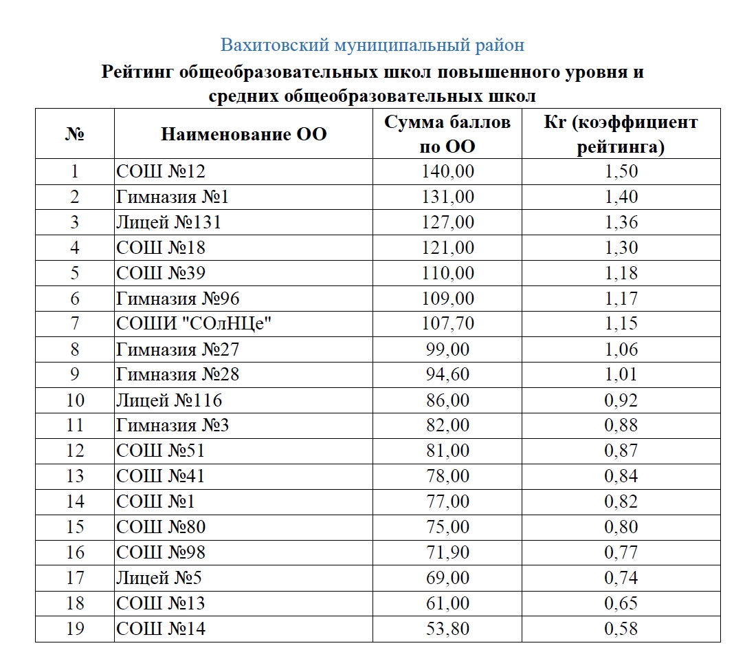 Опубликовано: 23.08.2016На прошедшем 19 августа в Иннополисе "Республиканском Августовском совещании" работников системы образования оглашены некоторые результаты анализа работы школ. В таблице приведен рейтинг среди общеобразовательных школ повышенного уровня и средних общеобразовательных школ. Первое место с рейтингом в 140 баллов занимает наша школа.