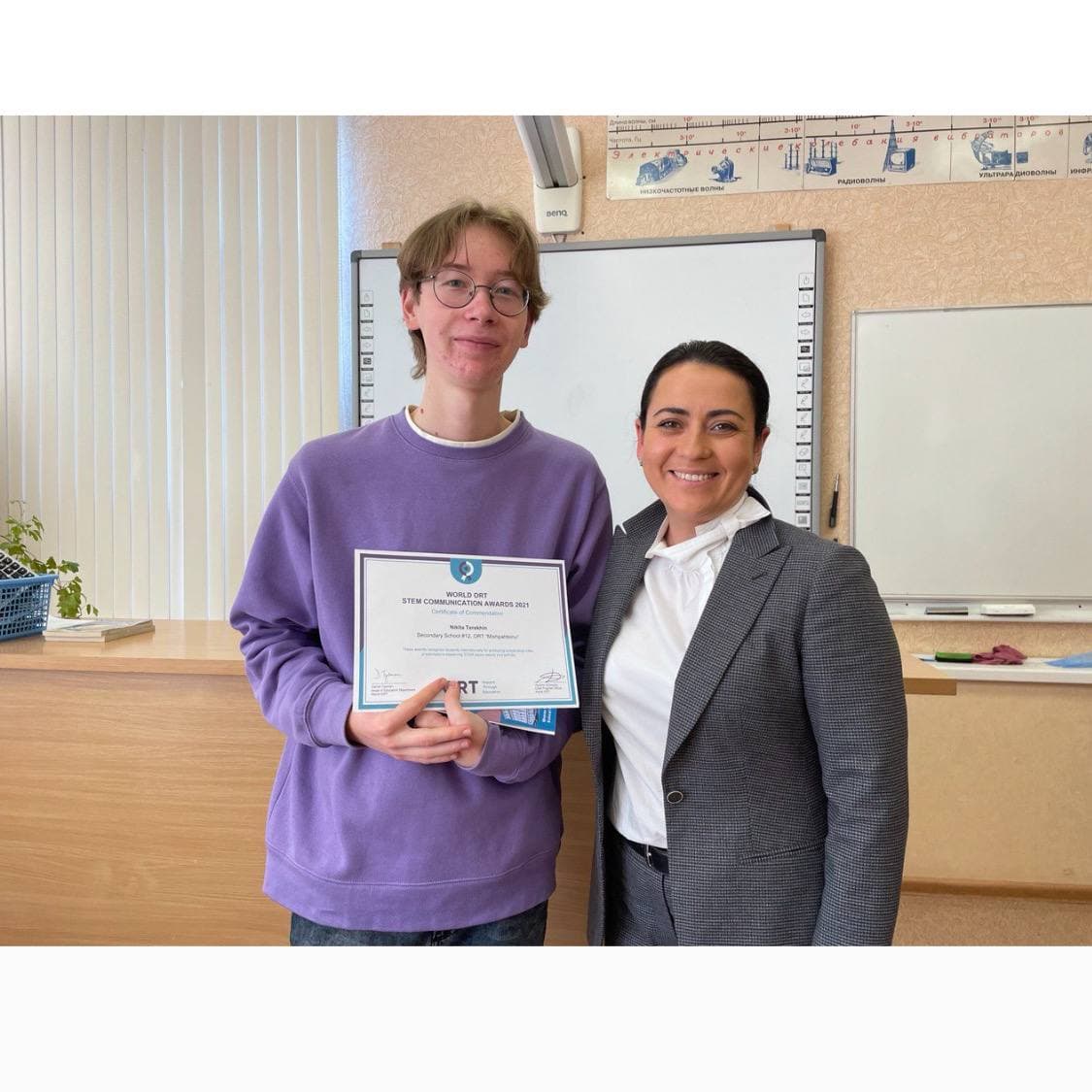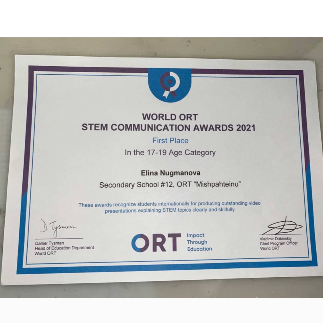 Ученица 11 класса Нугманова Элина стала победителем международного конкурса World ORT STEM Communication Awards 2021 (World ORT) в номинации «Ученики в возрасте 17-19 лет» Тема ее видео презентации - «Электромагнитный генератор как портативный источник электроэнергии». Проект был полностью переведён на английский язык и мы гордимся Элиной, что ее проект был оценён так высоко, и Элина была награждена ценным призом!
