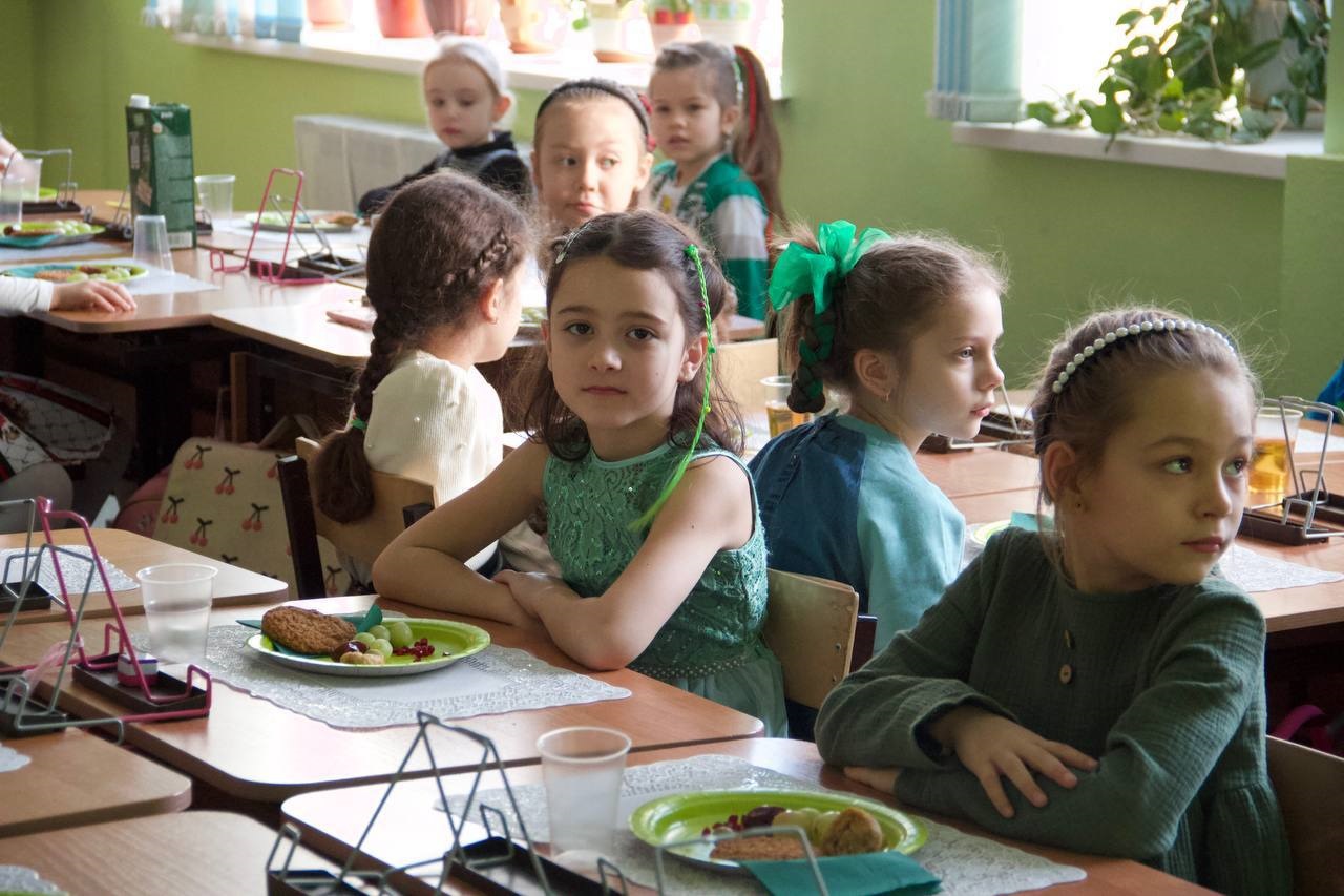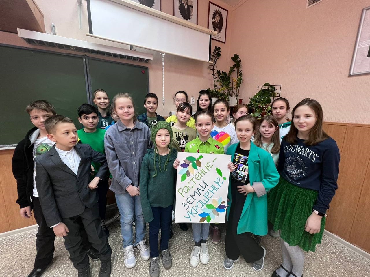 Сегодня мы всей школой пришли в зелёном, а в начальной школе даже стояло дерево, крону которого ученики делали из своих бумажных ладошек.