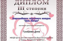 Поздравляем Гумерову Дину, обучающуюся объединения «Рукоделие»(педагог Абросимова Е.В.) с победой – Диплом IIIстепени- во Всероссийском творческом конкурсе «День Матери», номинация «История «Моя мама»». 15.01.2016