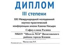 Поздравляем Сафиуллину Ралину с дипломом III степени XXI Международной молодежной научно-практической конференции имени Каюма Насыри. Руководитель Махмутова Р.Р.