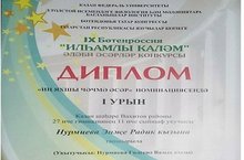11 нче сыйныф укучысы Нурмиева Энҗе Казан федераль университеты, Л.Толстой исемендәге филология һәм мәдәниятара багланышлар институты, Бөтендөнья татар конгресы, Татарстан Республикасы язучылар берлеге катнашында үткән IX Бөтенроссия "Илһамлы каләм" әдәби әсәрләр конкурсында катнашып, "Иң яхшы чәчмә әсәр" номинациясендә I урын яулады һәм диплом белән бүләкләнде. Энҗене әзердәгән укытучы Нурмиева Гөлгенә Вазых кызына иҗади фикерләү сәләтенә ия укучылар тәрбияләүгә керткән өлеше өчен Рәхмәт хаты тапшырылды. Котлыйбыз!